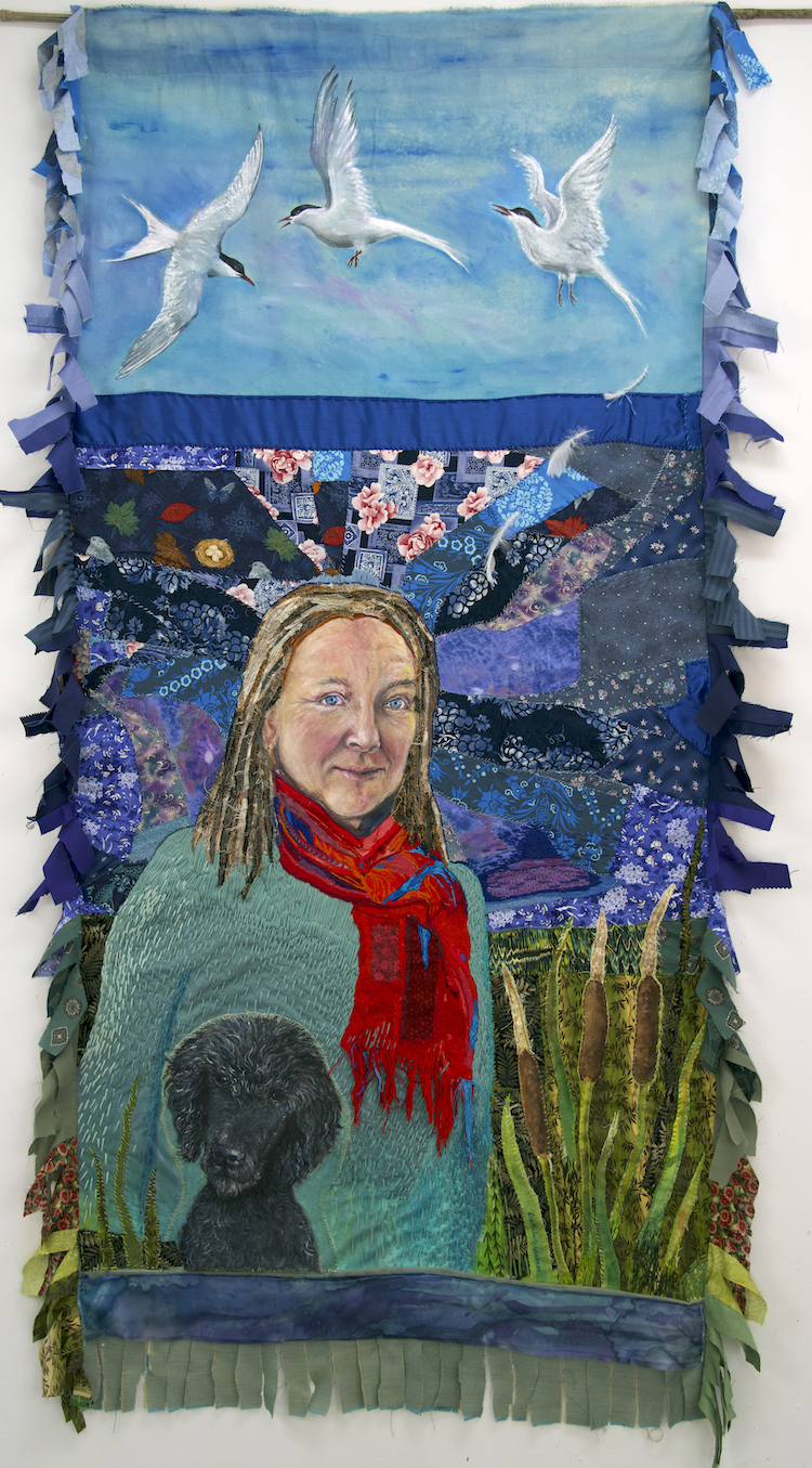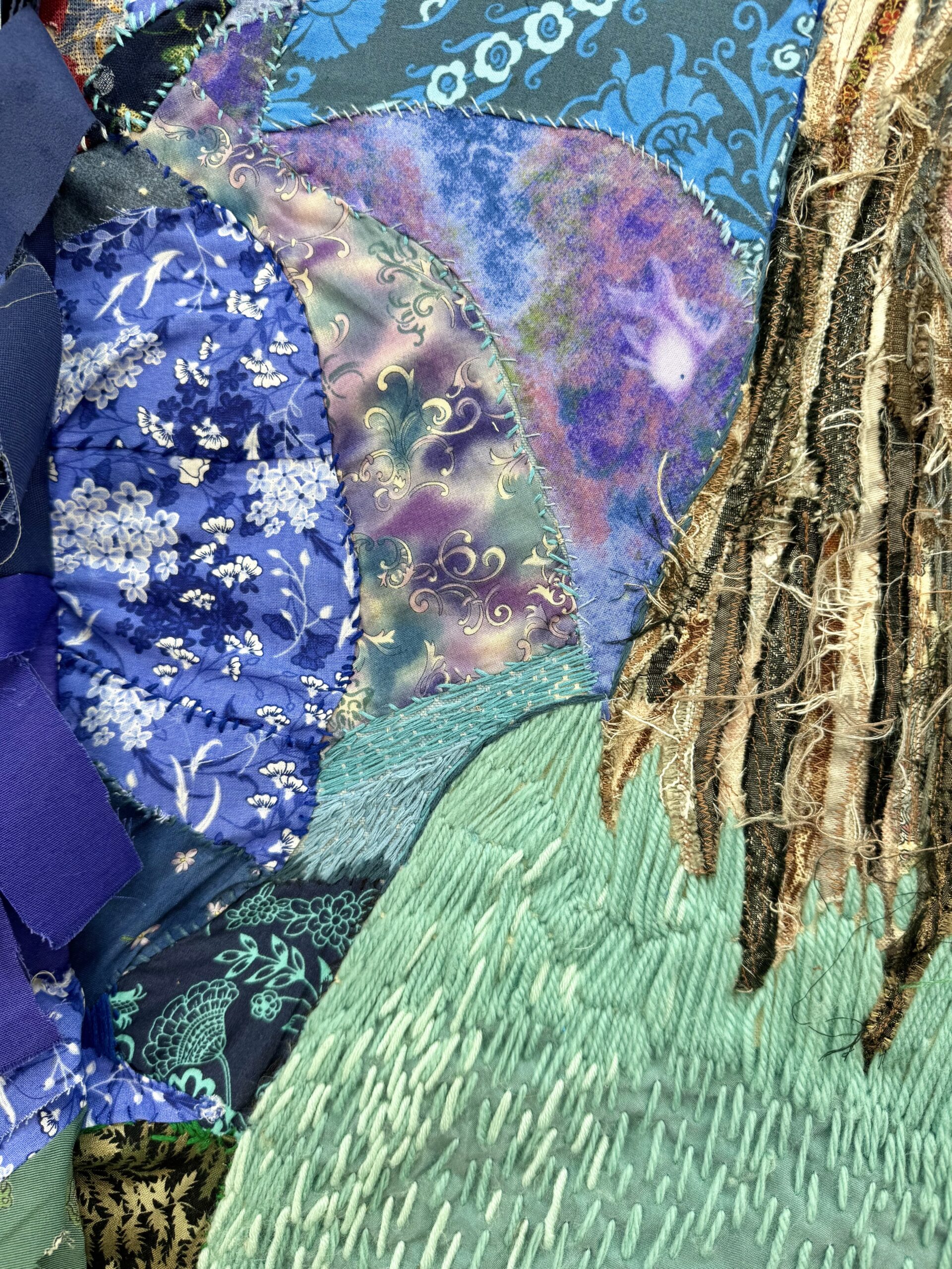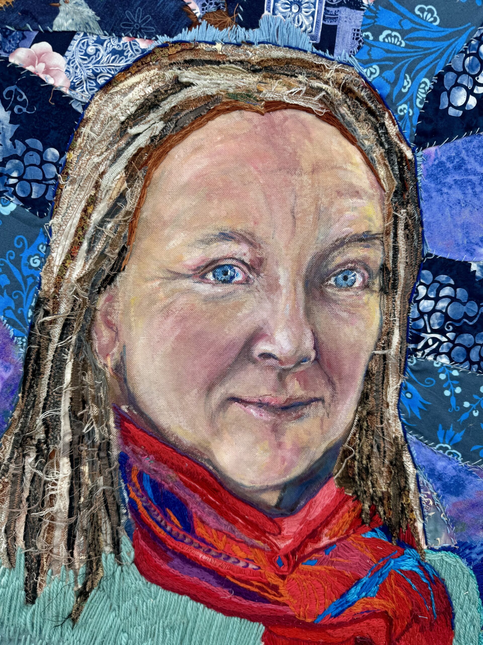 The portrait is created primarily from upcycled textiles, reflecting Kathleen’s commitment to environmentalism and her own practice as a fibre artist. I’ve combined acrylic paint with freehand machine sewing, crewel, embroidery, quilting, piecework, and appliqué, building layers that add meaning and visual density, much like the natural world I depict.