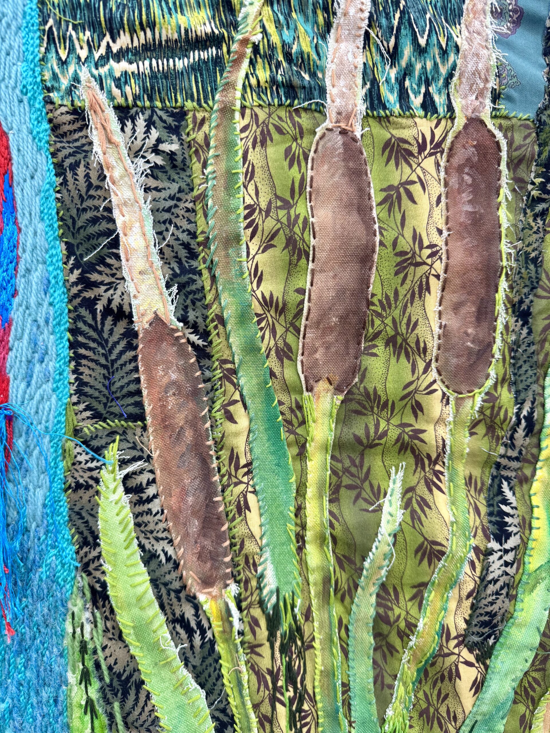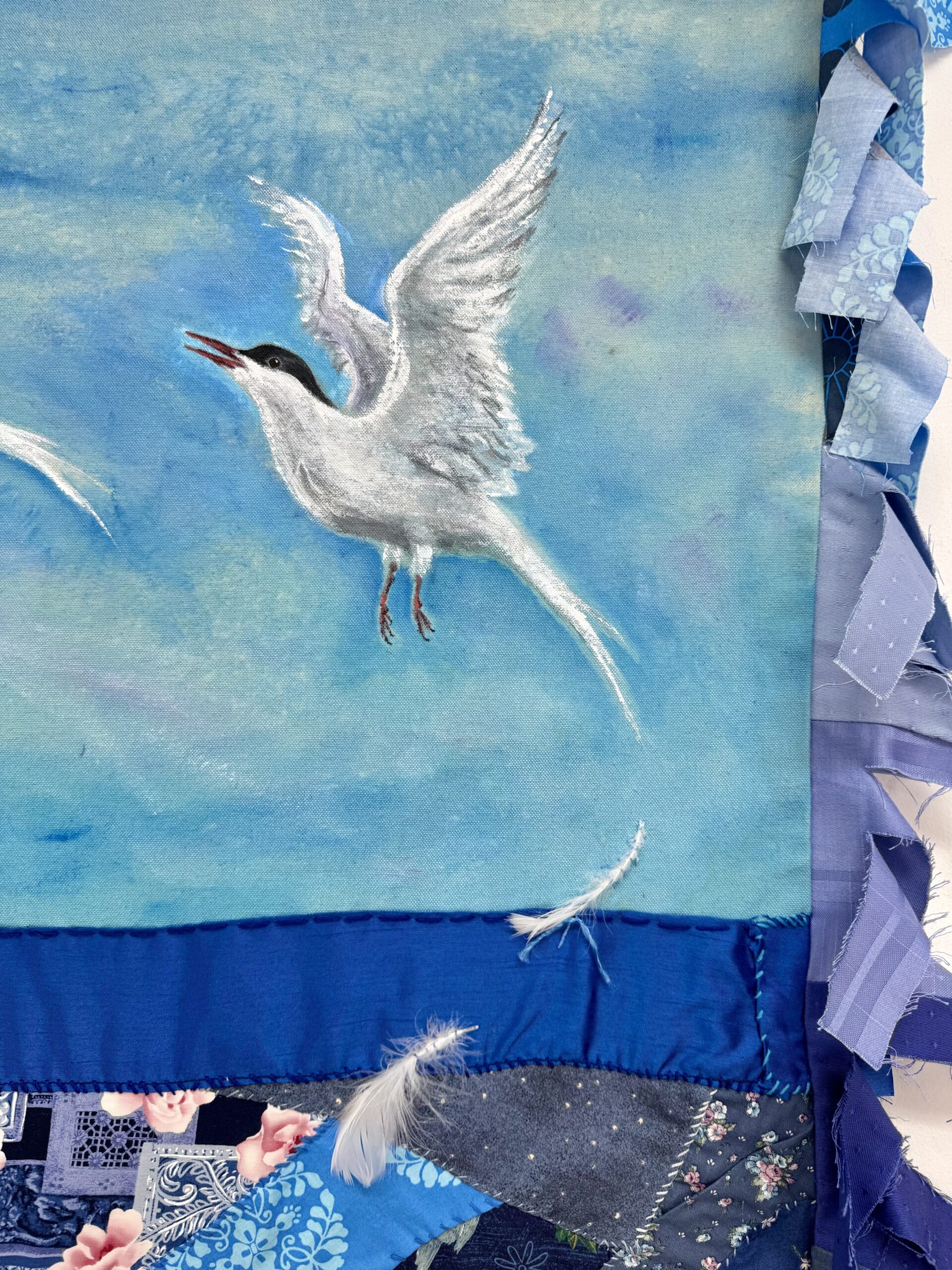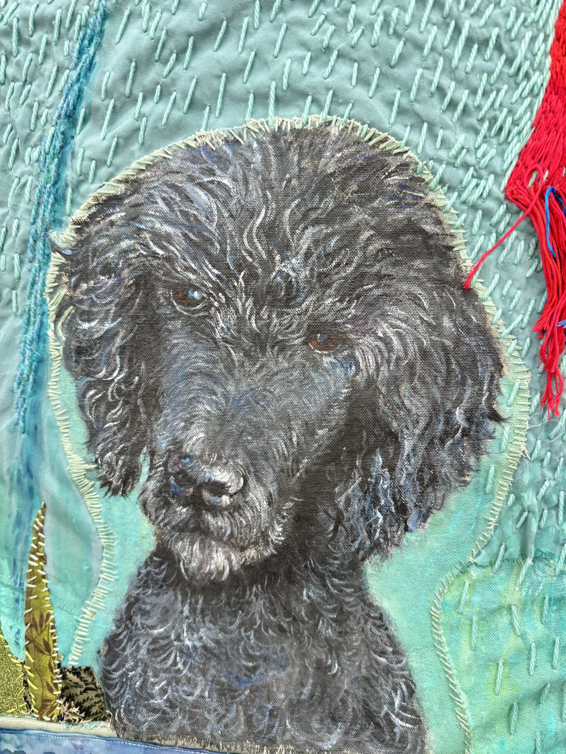 The portrait is created primarily from upcycled textiles, reflecting Kathleen’s commitment to environmentalism and her own practice as a fibre artist. I’ve combined acrylic paint with freehand machine sewing, crewel, embroidery, quilting, piecework, and appliqué, building layers that add meaning and visual density, much like the natural world I depict.