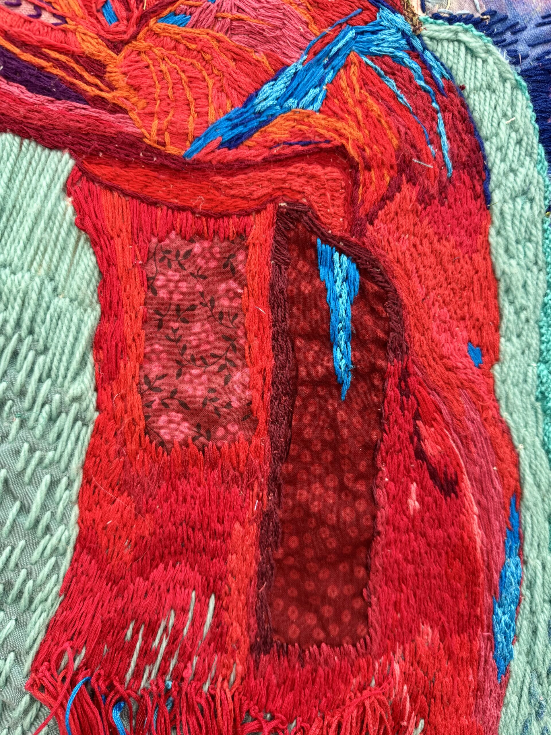 The piece is made with embroidery, appliqué, crewel, scrap fabrics, hand dyed silk, wool and acrylic paint on raw canvas, hung from foraged wood. It is 78” high (198 cm) by 45” (114 cm) wide. More about Kathleen Vaughan in this nice write up by EK Voland Gallery.